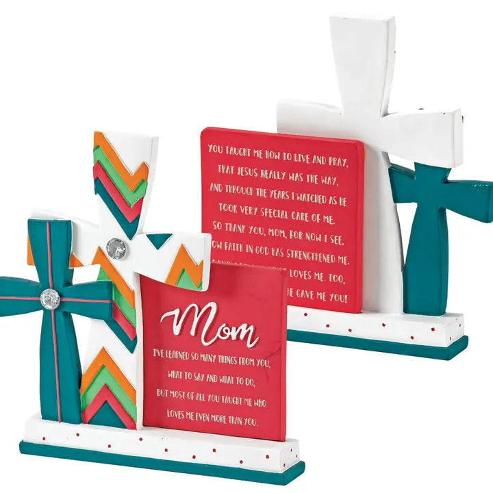 Mom I've learned so many things from you tabletop cross figurine stylish figurine features two colorful crosses with clear jewel accents plus a plaque with mom poem engraved front and back. Made of resin; size of piece is 6 1/8"H x 5 1/4"L x 1"W. Text of poem: mom I've learned so many things from you what to say and what to do but t of all you taught me who loves me even more than you. You taught me how to live and pray that Jesus really was the way and through the years I watched as he took very special care of me. So thank you mom for now I see how faith in God has strengthened me. I know how much he loves me too because dear mom he gave me you! Verse by Alda Maria copyright Dicksons.