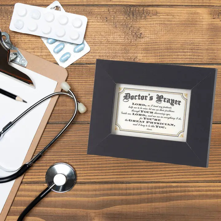 Doctor's Prayer Tabletop Framed Art/Photo Frame A doctor's prayer poem is arranged in attractive certificate style on this inspiring tabletop piece. Art is under glass. Frame opening is 4" x 6"; outer frame size is 6 3/4" x 8 5/8". Removable back section allows easy replacement of art with a favorite photo, if desired. Also on back is a pull-out easel stand and metal triangle wall hanger. Wood look frame is a super-sturdy polystyrene. Poem is by Robin Fogle ©Dicksons. Lord, as I treat my patie