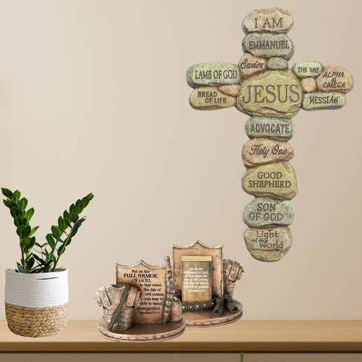 This figurine and verse card set can help you put on the full armor of God as described in Ephesians 6:13-17. Figurine has replicas of actual Biblical era armor, including shield, sword, helmet, belt and shoes. Shield is engraved with Ephesians 4:13, "Put on the full armor of God, so that when the day of evil comes, you may be able to stand your ground." Belt is also a holder for 10 small verse cards, each printed on both sides for a total of 20 verses that will help increase your trust in God.