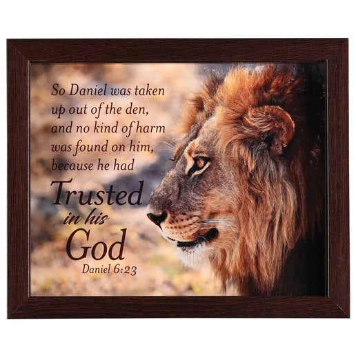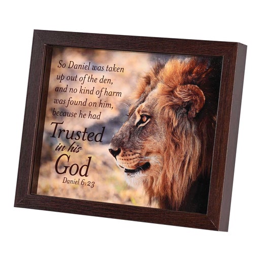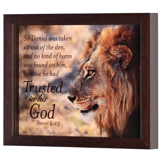 Shadow Box Style Framed Wall Decor Features Daniel 6:23: So Daniel Was Taken Up Out Of The Den, And No Kind Of Harm Was Found On Him, Because He Had Trusted In His God. Text Is Printed On The Underside Of Glass That Sits 3/4 Above Lion Artwork. Frame Is MDF Wood With Walnut Finish. Print/Glass Size Is 10 x 8; Outer Frame Size Is 11 x 1 1/4 x 9. Hanger On Back With Easel.