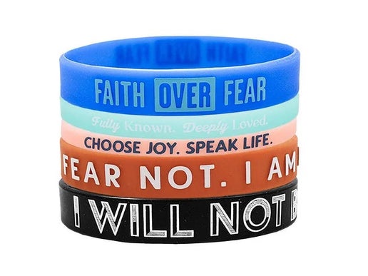 This pack of 12 comes with an assortment of any of our Large Power Bands - I Will Not Be Shaken, Fear Not, Faith Over Fear, Choose Joy Speak Life, and Fully Known Deeply Loved. All with a 3-3/4" Diameter.